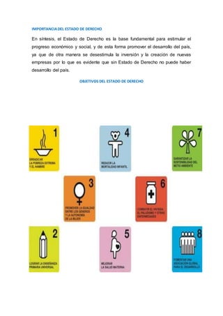 El Estado de Derecho se define como aquel en que las relaciones entre ciudadanos y el gobierno están reguladas por leyes que todos deben obedecer. Sus características principales son la división de poderes, el control mutuo entre ramas de gobierno, y el reconocimiento de derechos fundamentales. El Estado de Derecho promueve el desarrollo económico y social al estimular la inversión y crecimiento de empresas.