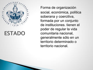 El documento describe las características de un Estado de derecho. Un Estado de derecho se rige por un sistema de leyes e instituciones ordenadas en torno a una constitución. Para que un Estado sea considerado de derecho, el poder debe estar institucionalizado y no personalizado, y tanto las normas jurídicas como las actuaciones de las autoridades deben respetar y promover los derechos fundamentales. Finalmente, para que un Estado de derecho sea efectivo, el derecho debe ser el principal instrumento de gobierno y la ley debe ser capaz de guiar la conducta humana