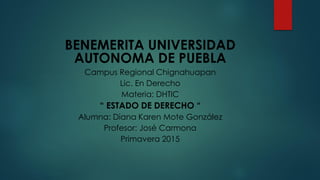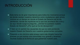 Este documento discute el concepto de Estado de Derecho, sus antecedentes históricos y su situación actual en México. Define el Estado de Derecho como aquel donde las autoridades gobiernan de acuerdo con las leyes vigentes y donde el poder del estado está limitado por el derecho. Aunque México ha buscado adoptar este modelo desde su independencia, persiste una brecha entre la norma legal y la realidad, con los derechos ciudadanos siendo vulnerados con frecuencia.