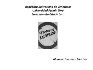 Este documento discute la declaración de estados de excepción en Venezuela según la Constitución de 1999. Explica que la declaración de estados de excepción es una atribución del Poder Ejecutivo Nacional cuando son insuficientes los medios ordinarios para enfrentar situaciones graves. Identifica cuatro tipos de estados de excepción y señala que una vez declarado, el Presidente puede delegar su ejecución a otras autoridades. Finalmente, indica que el decreto de declaración debe ser presentado a la Asamblea Nacional para su aprobación.