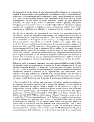El documento describe el desarrollo de los campus universitarios en Chile durante el siglo XX. Las universidades experimentaron un rápido crecimiento para satisfacer la demanda de educación profesional, lo que llevó a la creación de nuevos campus en Santiago y regiones. Los campus se diseñaron siguiendo los principios del urbanismo moderno, con un énfasis en la creación de un espacio central abierto que sirviera como corazón de la comunidad universitaria y permitiera el intercambio de ideas.
