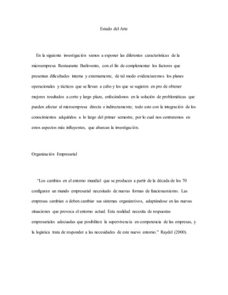 El documento resume la investigación sobre las características de la microempresa Restaurante Barlovento. Se analizan factores internos y externos que presentan dificultades y se sugieren planes operacionales y tácticos para mejorar los resultados a corto y largo plazo. También se examinan aspectos como la organización empresarial, el servicio al cliente, y la gastronomía colombiana que ofrece el restaurante, resaltando la importancia de adaptarse continuamente a las necesidades del cliente y del entorno.