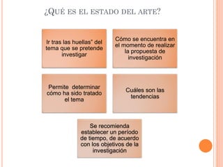 El documento explica lo que es un estado del arte, las fases y pasos para su construcción, y donde buscar información. Un estado del arte sigue las huellas de un tema de investigación, determina cómo ha sido tratado y sus tendencias. Incluye una búsqueda heurística de fuentes primarias y secundarias, luego un análisis hermenéutico de la información. Se recomienda articular los temas a través de títulos y subtítulos para un estado del arte cohesivo que lleve al lector hacia el interés particular