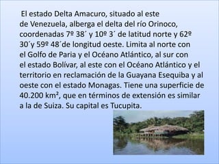 El estado Delta Amacuro se encuentra en el este de Venezuela y alberga el delta del río Orinoco. Incluye el Parque Nacional Mariusa que protege 331,000 hectáreas de marismas y turberas, y la capital es Tucupita. El documento también describe el Parque Nacional El Avila cerca de Caracas, y varias opciones de alojamiento en Delta Amacuro.