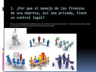Este documento resume las respuestas a tres preguntas sobre las finanzas y el control legal de una empresa. Explica que el manejo de las finanzas de una empresa privada tiene un control legal debido a las normas establecidas en la constitución. Señala que la Superintendencia Financiera se encarga de vigilar y mantener el control sobre las empresas para que cumplan con la ley. Por último, define el estado financiero como los documentos que una empresa usa para llevar un control sobre su situación financiera actual y pasada a través de balances generales.