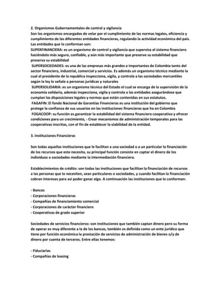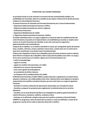 El documento describe la estructura del sistema financiero colombiano. Está compuesto por 4 ramas principales: organismos gubernamentales de asesoría y política, organismos gubernamentales de control y vigilancia, instituciones financieras y organismos multilaterales de crédito. Dentro de cada rama, se enumeran y brindan detalles sobre las diferentes entidades que la componen, como bancos, fiduciarias, superintendencias y agremiaciones del sector financiero.