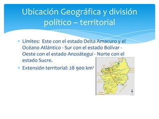 El estado Monagas se encuentra ubicado en el noreste de Venezuela y limita con los estados Sucre, Anzoátegui, Bolívar y Delta Amacuro, así como con el Océano Atlántico. Sus principales actividades económicas son la ganadería, la agricultura de cacao, caña de azúcar y yuca, y la industria petrolera. El estado cuenta con diversos parques y monumentos nacionales, así como una rica cultura representada en su folklore, artesanía y vestimenta tradicional.