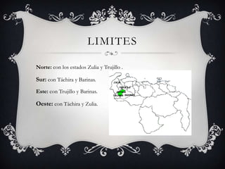 El documento proporciona información sobre el estado Mérida en Venezuela. Limita al norte con Zulia y Trujillo, al sur con Táchira y Barinas, al este con Trujillo y Barinas, y al oeste con Táchira y Zulia. Fue fundada en 1558 y su economía se centra en el turismo, la agricultura y la Universidad de Los Andes. Algunos de sus símbolos incluyen el himno, la bandera y animales como el bucare, el frailejón y el cóndor. El documento también describe parques n