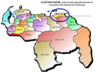 El Estado Sucre, ubicado en el noreste de Venezuela, tiene como capital a Cumaná, la primera ciudad fundada por los españoles en América en 1515. Cuenta con 15 municipios, una población de aproximadamente 824,764 habitantes y es conocido por su riqueza cultural, tradiciones, gastronomía y atractivos naturales como parques nacionales y playas. Su economía se basa en la pesca, el cacao, el café y el turismo.