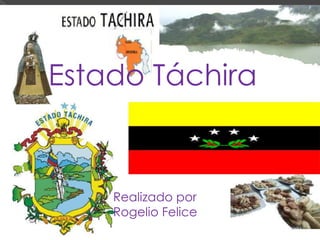 El documento proporciona información sobre el estado de Táchira en Venezuela. Limita por el norte con Zulia, por el sur con Apure y Colombia, por el este con Mérida y Barinas y por el oeste con Colombia. Su capital es San Cristóbal y sus principales actividades económicas son la pesca, la minería y la cría. Algunas de sus tradiciones culturales incluyen el traje típico andinito, la comida típica de hallacas y la bebida típica de chicha de arroz.