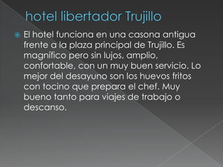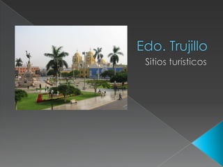 El documento contiene información sobre varios lugares de interés en el estado de Trujillo, Venezuela. Describe un hotel histórico frente a la plaza principal de Trujillo, el Parque Nacional Guaramacal que protege bosques andinos, varios parques y atracciones turísticas en ciudades como Betijoque, Boconó e Isnotú, y el Parque Nacional Dinira que se ubica en la Sierra de Barbacoas donde nace el río Tocuyo.