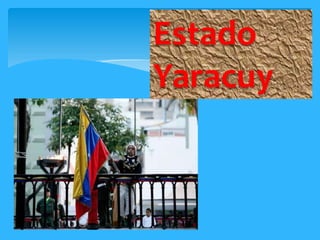 El documento proporciona información sobre el estado de Yaracuy en Venezuela. En 3 oraciones: Yaracuy se encuentra en el centroccidente de Venezuela y limita con varios estados. Yaracuy tiene una rica cultura que incluye bailes, leyendas, platos típicos y artesanías. La población de Yaracuy tiene costumbres sencillas caracterizadas por su dialecto único.