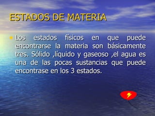 El documento resume los tres estados de la materia: sólido, líquido y gaseoso. Los sólidos tienen forma y volumen definidos y poco movimiento molecular debido a la fuerza de cohesión. Los gases tienen forma indefinida y movimiento molecular continuo debido a la fuerza de repulsión. Los líquidos adoptan la forma del recipiente, con movimiento molecular constante y volumen definido, debido a un equilibrio entre las fuerzas de cohesión y repulsión. Se presentan dos experimentos para ilustrar las diferencias entre los estados.