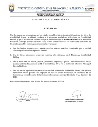 La institución educativa municipal Libertad, creada por decreto en 2003, presenta su balance general a 31 de diciembre de 2016, con activos totales de 635,178,328.79 y un patrimonio neto que incluye un excedente del ejercicio de 61,853,414.59. Los ingresos operacionales suman 540,525,728.18, mientras que los gastos operacionales alcanzan los 478,672,313.59, mostrando un déficit acumulado en ejercicios anteriores. La información financiera refleja un cumplimiento con la normativa de contabilidad pública y ha sido certificada por el rector y la contadora pública de la institución.