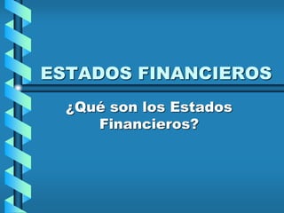 El documento explica que los estados financieros son documentos extraídos de los registros contables que brindan información sobre la situación financiera y los resultados de una entidad. Los principales estados financieros en Venezuela son el balance general, estado de resultados, estado de flujo de efectivo y estado de movimiento del patrimonio. El documento también cubre los objetivos, usuarios, contenido, limitaciones y ajustes por inflación de los estados financieros.