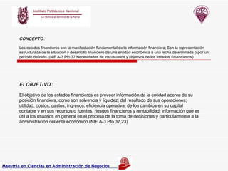 El documento describe los estados financieros, que son herramientas para proveer información sobre la situación financiera, resultados y flujos de efectivo de una entidad. Los estados financieros básicos son el estado de situación financiera, estado de resultados, estado de variaciones en el capital contable y estado de flujo de efectivo. Su objetivo es proveer información útil para la toma de decisiones de los usuarios como accionistas, acreedores y gerencia.