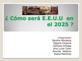 Este documento analiza cómo será Estados Unidos en 2025. Se espera que la población de Nigeria supere los 400 millones, superando a EE. UU. La crisis económica de 2008 afectó a EE. UU. y al mundo. Para 2025, EE. UU. ya no será una potencia dominante y 11 países emergerán como potencias económicas y políticas, incluidos China, India y Rusia. La tecnología, los seguros y el entretenimiento serán importantes industrias, y los consumidores tendrán más peso que los trabajadores.