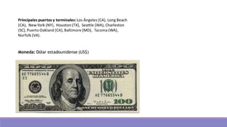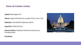 Este documento proporciona información sobre Estados Unidos, incluyendo su capital, idiomas, población, sistema político y principales ciudades. Además, detalla los principales productos agrícolas e industriales del país, así como sus principales exportaciones e importaciones. Finalmente, resume brevemente la cronología y alcance del acuerdo de libre comercio entre Estados Unidos y Colombia.