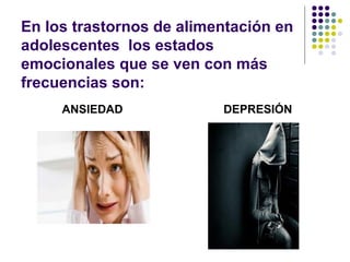 Este documento describe los estados emocionales comunes de ansiedad y depresión que se ven con frecuencia en los trastornos alimenticios en adolescentes. Explica los síntomas de la ansiedad como inquietud, preocupación y tensión, y los síntomas de la depresión como tristeza, desesperación y pérdida de energía. Además, señala que la ansiedad y depresión a menudo están asociadas con trastornos alimenticios como la anorexia nerviosa, bulimia nerviosa y obesidad.