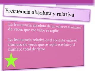 Este documento presenta los conceptos básicos de estadística, incluyendo variables estadísticas cualitativas y cuantitativas, frecuencias absolutas y relativas, formas de representar datos agrupados como histograma y polígono de frecuencias, y medidas de tendencia central como la media, la mediana y la moda. El documento proporciona definiciones concisas de estos términos estadísticos fundamentales.