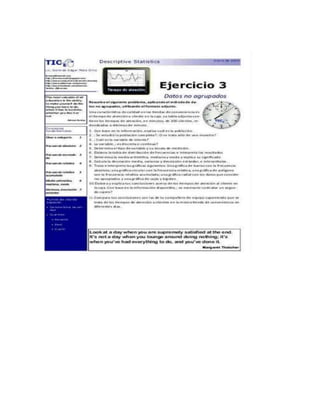 Este documento presenta los resultados de un estudio sobre el tiempo de atención a clientes en una tienda de conveniencia. Incluye tablas de frecuencia, gráficas y una interpretación de los datos. La media del tiempo de atención fue de 3.90 minutos, lo que indica que los tiempos están dentro del estándar permitido. Aunque la variación no es muy grande, el estudio ayudará a la tienda a brindar un mejor servicio analizando más detalladamente los pros y contras de la atención actual a clientes.