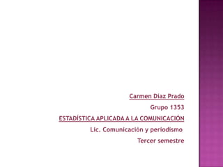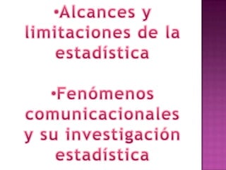 La estadística es un conjunto de métodos científicos para la recolección, organización, análisis y presentación de datos para deducir conclusiones y tomar decisiones razonables. Se divide en estadística descriptiva, que describe variables aleatorias en muestras, y estadística inductiva o inferencial, que generaliza resultados de muestras a poblaciones y evalúa estimaciones e hipótesis. La estadística mide asociaciones pero no explica causas, y es útil para planear recolección de datos, analizarlos,