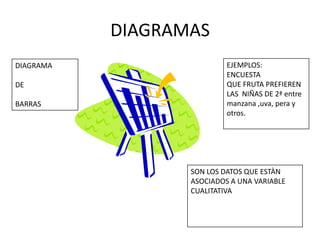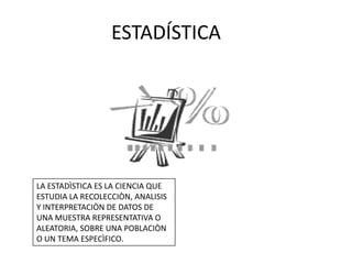Este documento proporciona una introducción a la estadística, incluyendo su definición como la ciencia que estudia la recolección, análisis e interpretación de datos de una muestra representativa o aleatoria sobre una población o tema específico. También describe los diagramas de barras y circulares para representar datos cualitativos y cuantitativos, respectivamente, así como conceptos clave como moda, muestra, población y sus definiciones.