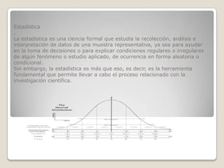 El documento trata sobre el tema de la estadística. Explica que la estadística estudia la recolección, análisis e interpretación de datos de una muestra representativa para ayudar en la toma de decisiones o explicar fenómenos. Se divide en estadística descriptiva, que se dedica a la descripción y resumen de datos, y estadística inferencial, que se usa para modelar patrones en los datos y extraer inferencias. También define conceptos clave como población, muestra, variables y tipos de variables.
