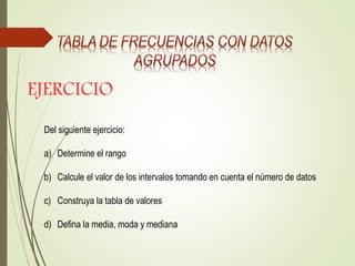 Este documento presenta los pasos para resolver un ejercicio estadístico que incluye calcular el rango, construir una tabla de frecuencias e intervalos, y determinar la media, moda y mediana. Primero se calcula el rango como el valor mayor (97) menos el menor (55), dando un rango de 42. Luego se dividen los datos en 6 intervalos de 8 datos cada uno y se construye la tabla de frecuencias. Finalmente, se calcula la media como la suma de los productos de las marcas de clase por sus frecuencias dividido entre el total de datos