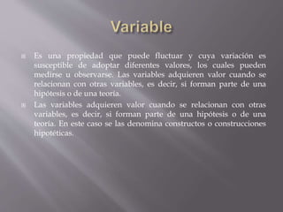 El documento define conceptos estadísticos fundamentales como variables, muestras, parámetros, escalas de medición, razones, proporciones, tasas y frecuencias. Explica que las variables pueden ser cualitativas u cuantitativas, y que las muestras son subconjuntos de una población estadística. También define parámetros, escalas de medición, y diferentes tipos de razones, proporciones y tasas.