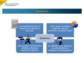 El documento aborda la utilidad de la estadística en la planificación y organización educativa, destacando la importancia de fuentes de datos, tanto primarias como secundarias. Se describen diferentes métodos estadísticos, incluyendo la estadística descriptiva e inductiva, y se explica la diferencia entre población y muestra. Finalmente, se presentan referencias relevantes sobre la estadística aplicada al ámbito educativo.
