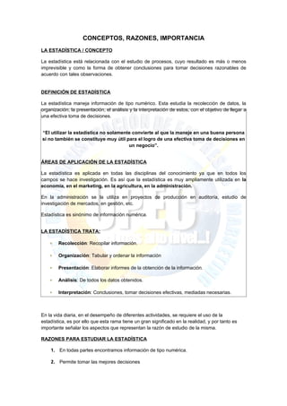 Este documento presenta una introducción general a la estadística. Explica que la estadística estudia la recolección, organización, presentación, análisis e interpretación de datos numéricos para tomar decisiones efectivas. También describe que la estadística se aplica en diversas áreas como economía, marketing y administración. Finalmente, resume los tipos de estadística, variables, niveles de medición y fuentes de datos.