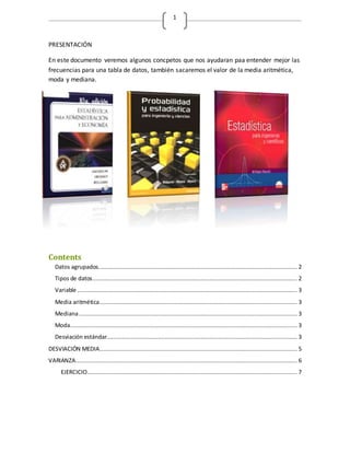 Este documento presenta conceptos estadísticos como media aritmética, moda, mediana, desviación estándar y varianza. Incluye un ejercicio sobre datos de ventas de tazas de café durante 10 periodos para determinar si es conveniente abrir un negocio de café.