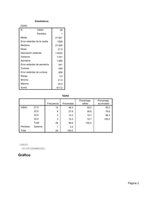Este documento presenta los resultados del análisis estadístico de la variable EDAD en un conjunto de datos de 29 casos. Se calculan estadísticos descriptivos como media, moda, desviación estándar, asimetría y curtosis. Se genera un histograma de la variable. Finalmente, se muestran estadísticos descriptivos detallados de la variable EDAD.