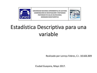 Este documento proporciona una introducción a la estadística descriptiva para una variable. Explica que la estadística descriptiva se refiere a la descripción, clasificación y representación gráfica de datos. Luego describe las tablas de frecuencias, los gráficos y las medidas estadísticas comunes como la media, mediana, varianza y desviación estándar que se usan para resumir y caracterizar un conjunto de datos.