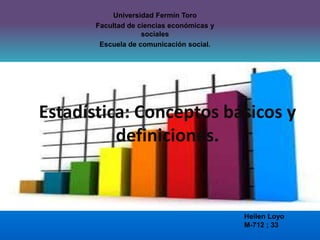 El documento define conceptos básicos de estadística como población, muestra, variable, dato y parámetro. Explica que una población es un conjunto de elementos con características comunes, mientras que una muestra es una porción de la población. También describe diferentes tipos de muestras y variables, así como métodos estadísticos como descriptiva, inferencial y probabilidad.