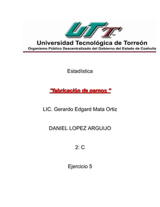 El documento presenta un ejercicio sobre el análisis estadístico de datos de diámetros de pernos. Se inspeccionaron 300 piezas y se agruparon los datos en 11 intervalos para calcular medidas de tendencia central y dispersión. Se trazaron gráficas como un histograma, diagrama circular y ojiva para interpretar los resultados en términos de si el lote cumple con las especificaciones del cliente.