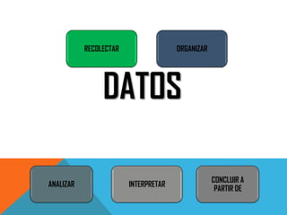 Este documento presenta los elementos básicos de la estadística, incluyendo cómo recolectar, organizar y analizar datos. Explica conceptos como población, muestra e individuo, y métodos para seleccionar muestras como muestreo por conveniencia, criterio y cuotas. También cubre temas como variables cualitativas y cuantitativas, escalas de medición, fuentes de información y organización de datos en tablas de frecuencias.