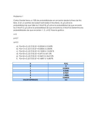 Este documento presenta 5 problemas de probabilidad y estadística resueltos. El Problema 1 calcula las probabilidades de encestar diferentes números de tiros libres. El Problema 2 calcula las probabilidades de defectos en una muestra. El Problema 3 calcula valores esperados con una tasa de defectos mayor. El Problema 4 analiza los resultados de inspecciones a proveedores. El Problema 5 presenta un diagrama de Ishikawa y Pareto y las acciones tomadas para corregir problemas con proveedores.