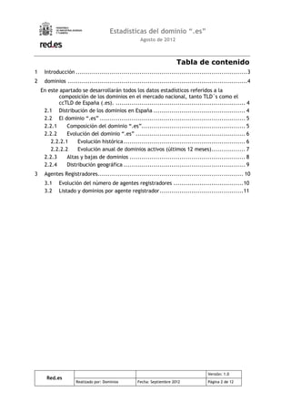 Este documento proporciona estadísticas sobre el dominio ".es" en España para agosto de 2012. Resume que: