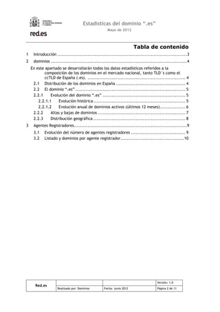 Este documento presenta estadísticas sobre el dominio ".es" en España para mayo de 2012. Muestra que el número de dominios ".es" registrados ha ido aumentando con el tiempo y alcanzó 1,548,884 en mayo de 2012. La mayor concentración de dominios se encuentra en la Comunidad de Madrid y Cataluña. El agente registrador con más dominios es 1&1 Internet con 308,724 dominios.