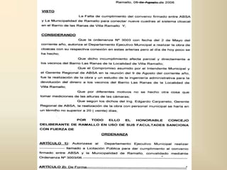El documento contiene minutas de comunicación realizadas por un bloque político, documentación sobre ordenanzas y decretos municipales, y un acta de ejecución de obra y ordenanza relacionadas con un barrio llamado "Barrio las Ranas".