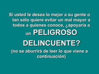 El documento advierte sobre un candidato presidencial que supuestamente cometió varios delitos financieros en el pasado, como estafar un banco y lavar dinero. Proporciona detalles sobre su supuesta participación en una asociación ilícita que creó empresas ficticias, y sobre cómo la CIA lo ayudó a escapar del país para evitar ser enjuiciado. También cuestiona su honestidad e intenciones de gobierno. El objetivo es alertar sobre este candidato y pedir que se vote de manera informada.