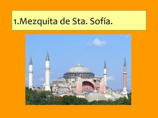 Este documento lista 10 lugares que se pueden visitar en Estambul, Turquía, incluyendo la Mezquita de Santa Sofía, la Mezquita Azul, el Palacio de Topkapi y el Gran Bazar. El autor, Iván de Lucas Rogero, indica que sus lugares favoritos fueron la Mezquita de Santa Sofía, el Gran Bazar, la Torre Gálata y la Cisterna Basílica.