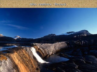 Este documento presenta una lista de 38 lugares y paisajes notables de Colombia, organizados por departamento. Incluye destinos populares como la Sierra Nevada de Santa Marta, el Caño Cristales, el Parque Nacional Natural de Los Nevados, y las playas del Pacífico y el Caribe, así como lugares menos conocidos como las Cavernas de Santander, el Cerro Tusa, y el Desierto de la Tatacoa. La lista ofrece una visión general de la diversidad geográfica de Colombia y algunos de sus principales atractivos turísticos y naturales.