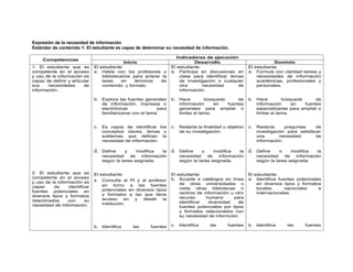 Este documento presenta un estándar de contenido sobre la expresión de la necesidad de información. Describe 4 competencias clave que un estudiante debe desarrollar para determinar efectivamente sus necesidades de información. Cada competencia incluye indicadores de ejecución en 3 niveles: inicio, desarrollo y dominio. El resumen cubre la capacidad de un estudiante para definir claramente sus necesidades de información, identificar fuentes potenciales en diversos formatos, considerar costos y beneficios, y redefinir constantemente su necesidad de inform