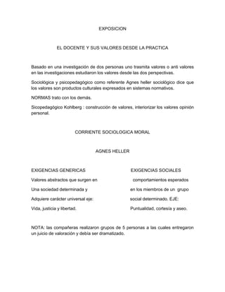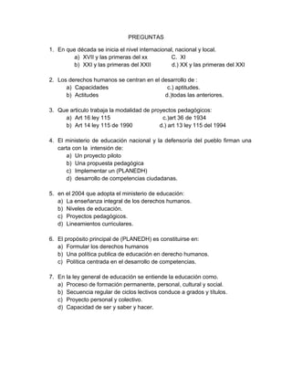 El documento contiene 7 preguntas sobre temas relacionados con los derechos humanos, la educación y los niveles de educación a nivel internacional, nacional y local. También incluye información sobre corrientes sociológicas de la moral, valores y anti-valores transmitidos por docentes, y un ejemplo de estándar para incentivar el cuidado del medio ambiente en los niños.