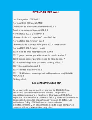 El documento presenta información sobre varios estándares IEEE 802 para redes de área local. Brevemente describe las 12 categorías de estándares 802, incluyendo 802.1 para interconexión de redes, 802.2 para control de enlace lógico, 802.3 para ethernet, 802.4 para token bus, y 802.5 para token ring. También menciona estándares como 802.6 para redes de área metropolitana y 802.7 para técnicas de banda ancha.