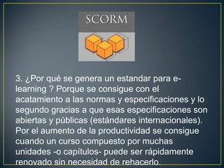 El documento describe los elementos clave de un curso de e-learning, incluyendo módulos, actividades, simulaciones y evaluaciones. Explica que los estándares de e-learning permiten la renovación rápida de cursos y el acceso universal a la educación de alta calidad. Identifica la interoperabilidad, reusabilidad, manejo, accesibilidad, durabilidad, escalabilidad y efectividad de costos como habilidades fundamentales para el diseño de contenidos y plataformas de e-learning.