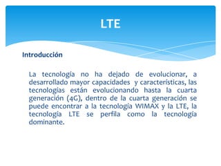La tecnología LTE (Long Term Evolution) es un estándar de comunicaciones móviles que surge como evolución de la 4G para satisfacer la demanda de mayores velocidades de transmisión de datos. Con características como altas tasas de bits y baja latencia, permite una experiencia de usuario optimizada y es fácil de implementar por los operadores. Comparada con sus predecesores, como UMTS y HSPA, LTE ofrece velocidades significativamente superiores, permitiendo descargas y servicios multimedia más eficientes.